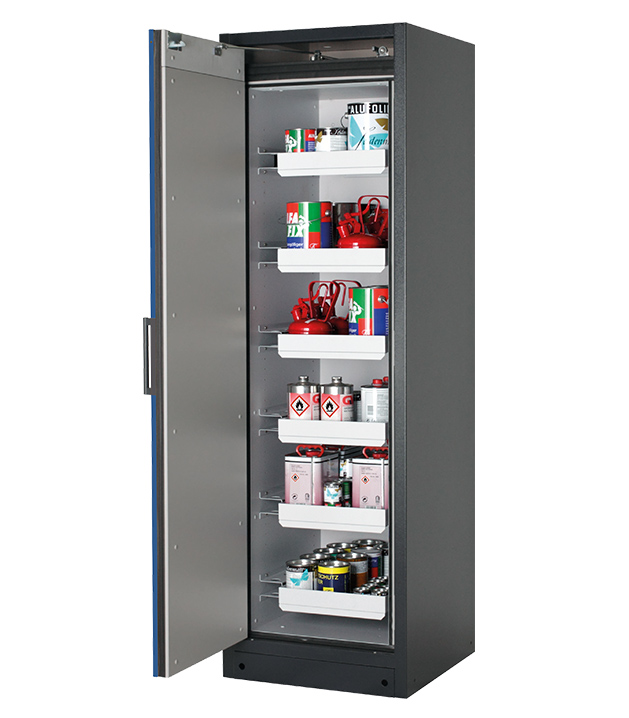 Korpusfarbe Anthrazitgrau (RAL 7016), mit Flügeltür in Enzianblau (RAL 5010), Inneneinrichtung mit 6 x Auszugswanne (Stahlblech pulverbeschichtet)