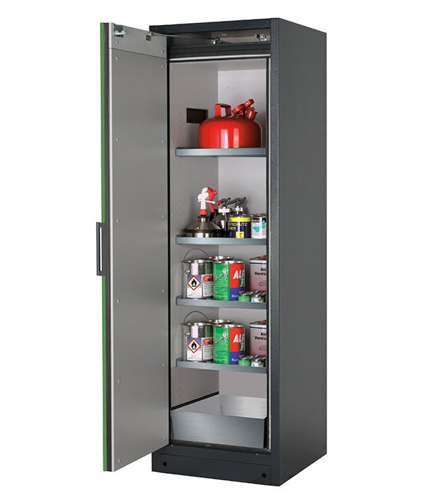 Korpusfarbe Anthrazitgrau (RAL 7016), mit Flügeltür in Resedagrün (RAL 6011), Inneneinrichtung mit 4 x Fachboden (Edelstahl 1.4301), 1 x Bodenauffangwanne (Edelstahl 1.4016)
