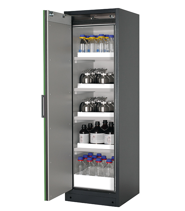 Korpusfarbe Anthrazitgrau (RAL 7016), mit Flügeltür in Resedagrün (RAL 6011), Inneneinrichtung mit 4 x Wannenboden, 1 x Bodenauffangwanne (PP)