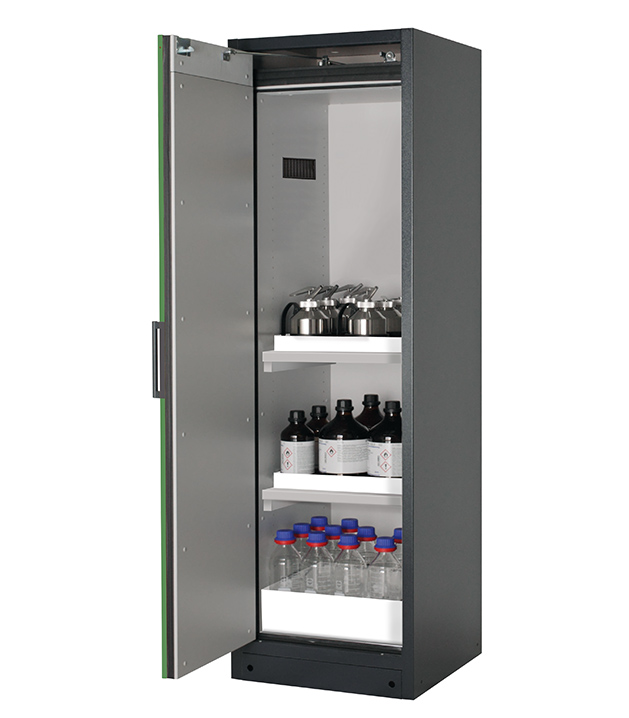 Korpusfarbe Anthrazitgrau (RAL 7016), mit Flügeltür in Resedagrün (RAL 6011), Inneneinrichtung mit 2 x Wannenboden, 1 x Bodenauffangwanne (PP)