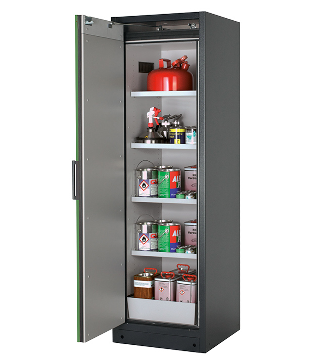 Korpusfarbe Anthrazitgrau (RAL 7016), mit Flügeltür in Resedagrün (RAL 6011), Inneneinrichtung mit 4 x Fachboden, 1 x Lochblecheinsatz, 1 x Bodenauffangwanne (Stahlblech pulverbeschichtet)