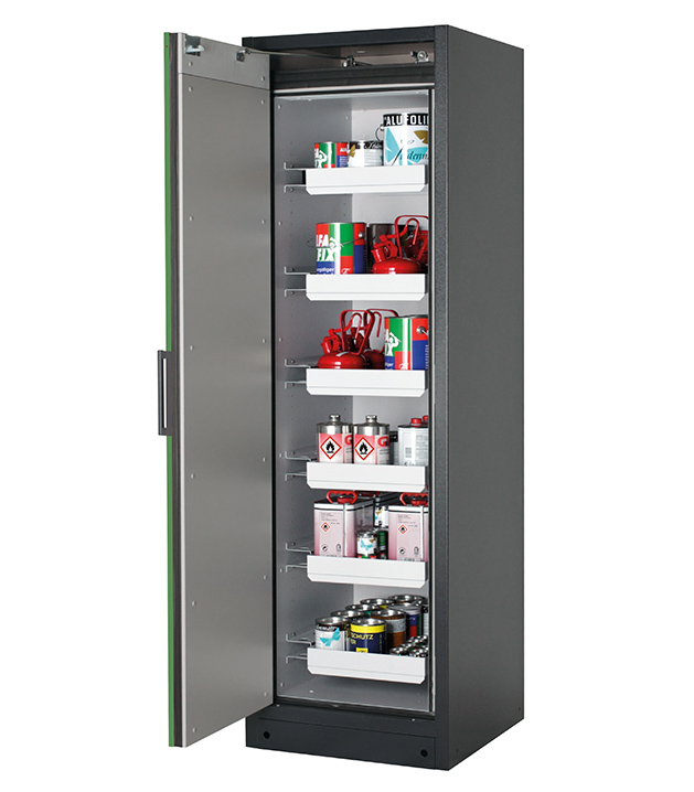 Korpusfarbe Anthrazitgrau (RAL 7016), mit Flügeltür in Resedagrün (RAL 6011), Inneneinrichtung mit 6 x Auszugswanne (Stahlblech pulverbeschichtet)