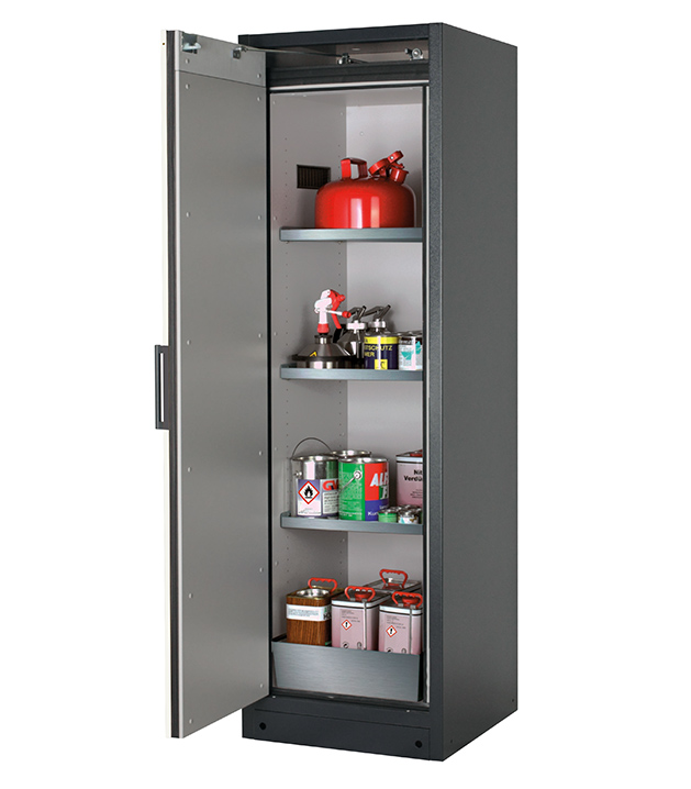 Korpusfarbe Anthrazitgrau (RAL 7016), mit Flügeltür in asecos Silber, Inneneinrichtung mit 3 x Fachboden (Edelstahl 1.4301), 1 x Lochblecheinsatz, 1 x Bodenauffangwanne (Edelstahl 1.4016)