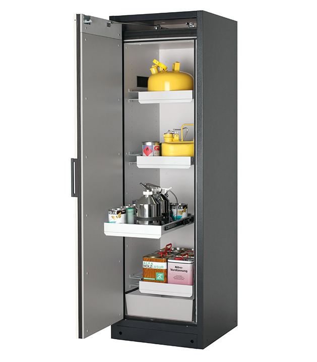 Korpusfarbe Anthrazitgrau (RAL 7016), mit Flügeltür in asecos Silber, Inneneinrichtung mit 3 x Auszugswanne, 1 x Auszugswanne Entsorgung, 1 x Bodenauffangwanne (Stahlblech pulverbeschichtet)