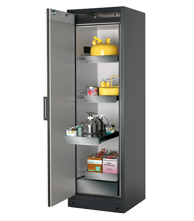Korpusfarbe Anthrazitgrau (RAL 7016), mit Flügeltür in asecos Silber, Inneneinrichtung mit 3 x Auszugswanne, 1 x Auszugswanne Entsorgung (Edelstahl 1.4301), 1 x Bodenauffangwanne (Edelstahl 1.4016)