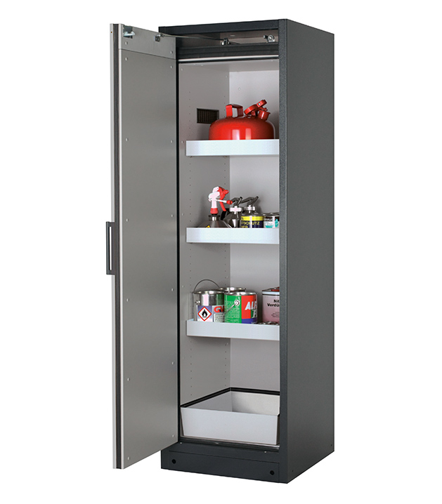 Korpusfarbe Anthrazitgrau (RAL 7016), mit Flügeltür in asecos Silber, Inneneinrichtung mit 3 x Wannenboden, 1 x Bodenauffangwanne (Stahlblech pulverbeschichtet)
