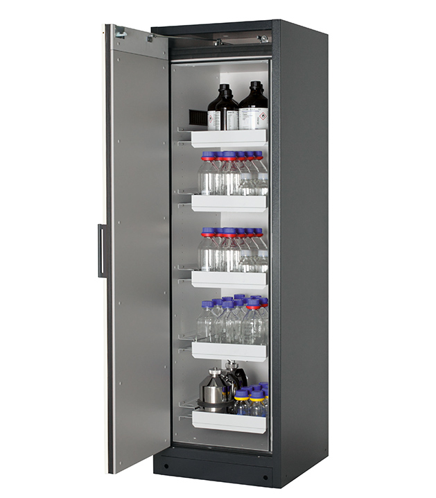 Korpusfarbe Anthrazitgrau (RAL 7016), mit Flügeltür in asecos Silber, Inneneinrichtung mit 5 x Auszugswanne (Stahlblech pulverbeschichtet)