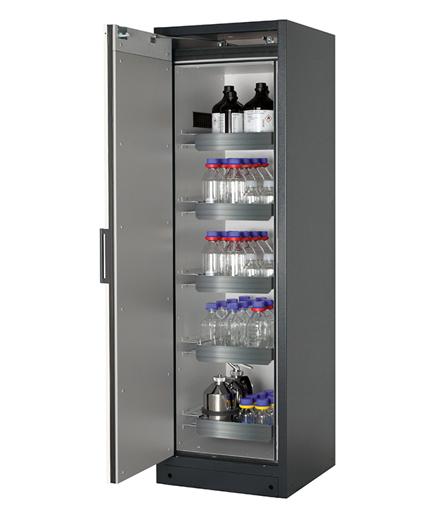 Korpusfarbe Anthrazitgrau (RAL 7016), mit Flügeltür in asecos Silber, Inneneinrichtung mit 5 x Auszugswanne (Edelstahl 1.4301)