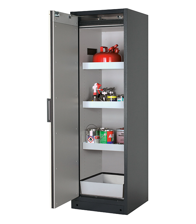 Korpusfarbe Anthrazitgrau (RAL 7016), mit Flügeltür in Reinweiß (RAL 9010), Inneneinrichtung mit 3 x Wannenboden, 1 x Bodenauffangwanne (Stahlblech pulverbeschichtet)