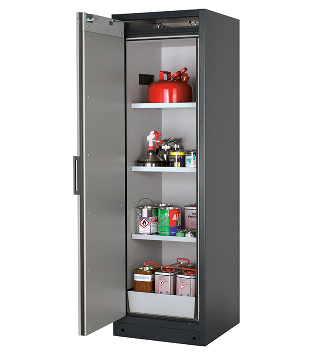Korpusfarbe Anthrazitgrau (RAL 7016), mit Flügeltür in Reinweiß (RAL 9010), Inneneinrichtung mit 3 x Fachboden, 1 x Lochblecheinsatz, 1 x Bodenauffangwanne (Stahlblech pulverbeschichtet)