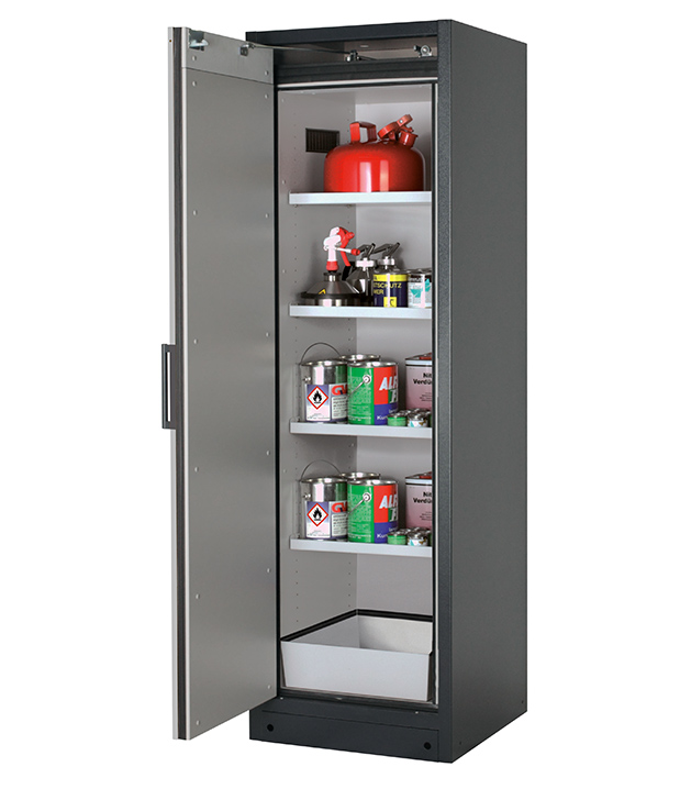 Korpusfarbe Anthrazitgrau (RAL 7016), mit Flügeltür in Reinweiß (RAL 9010), Inneneinrichtung mit 4 x Fachboden, 1 x Bodenauffangwanne (Stahlblech pulverbeschichtet)