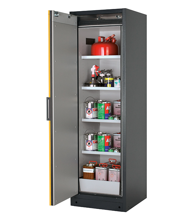 Korpusfarbe Anthrazitgrau (RAL 7016), mit Flügeltür in Sicherheitsgelb (RAL 1004), Inneneinrichtung mit 4 x Fachboden, 1 x Lochblecheinsatz, 1 x Bodenauffangwanne (Stahlblech pulverbeschichtet)