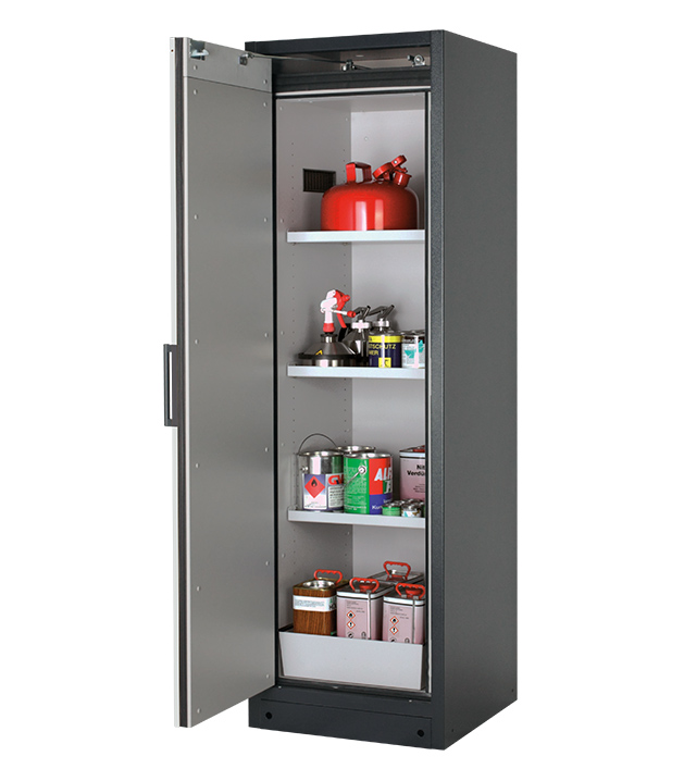 Korpusfarbe Anthrazitgrau (RAL 7016), mit Flügeltür in Lichtgrau (RAL 7035), Inneneinrichtung mit 3 x Fachboden, 1 x Bodenauffangwanne (Stahlblech pulverbeschichtet)
