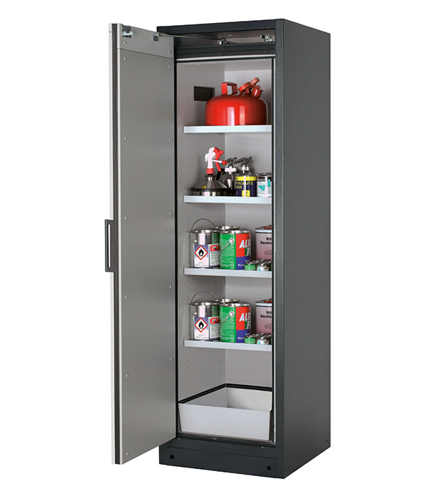 Korpusfarbe Anthrazitgrau (RAL 7016), mit Flügeltür in Lichtgrau (RAL 7035), Inneneinrichtung mit 4 x Fachboden, 1 x Bodenauffangwanne (Stahlblech pulverbeschichtet)