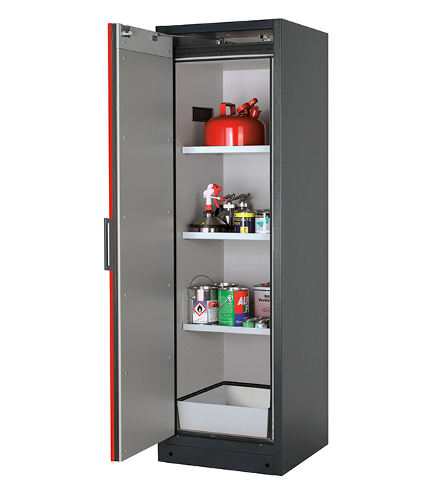 Korpusfarbe Anthrazitgrau (RAL 7016), mit Flügeltür in Verkehrsrot (RAL 3020), Inneneinrichtung mit 3 x Fachboden, 1 x Bodenauffangwanne (Stahlblech pulverbeschichtet)