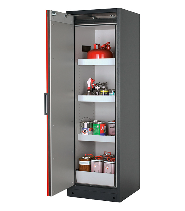 Korpusfarbe Anthrazitgrau (RAL 7016), mit Flügeltür in Verkehrsrot (RAL 3020), Inneneinrichtung mit 3 x Wannenboden, 1 x Lochblecheinsatz, 1 x Bodenauffangwanne (Stahlblech pulverbeschichtet)