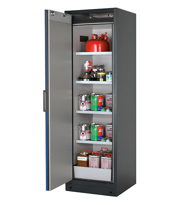 Korpusfarbe Anthrazitgrau (RAL 7016), mit Flügeltür in Enzianblau (RAL 5010), Inneneinrichtung mit 4 x Fachboden, 1 x Lochblecheinsatz, 1 x Bodenauffangwanne (Stahlblech pulverbeschichtet)