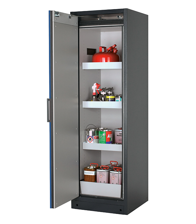 Korpusfarbe Anthrazitgrau (RAL 7016), mit Flügeltür in Enzianblau (RAL 5010), Inneneinrichtung mit 3 x Wannenboden, 1 x Lochblecheinsatz, 1 x Bodenauffangwanne (Stahlblech pulverbeschichtet)