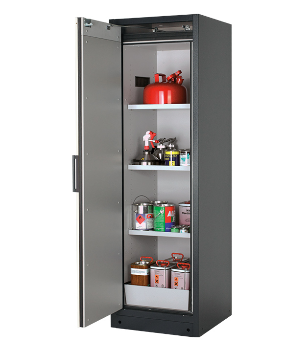Korpusfarbe Anthrazitgrau (RAL 7016), mit Flügeltür in Reinweiß (RAL 9010), Inneneinrichtung mit 3 x Fachboden, 1 x Lochblecheinsatz, 1 x Bodenauffangwanne (Stahlblech pulverbeschichtet)