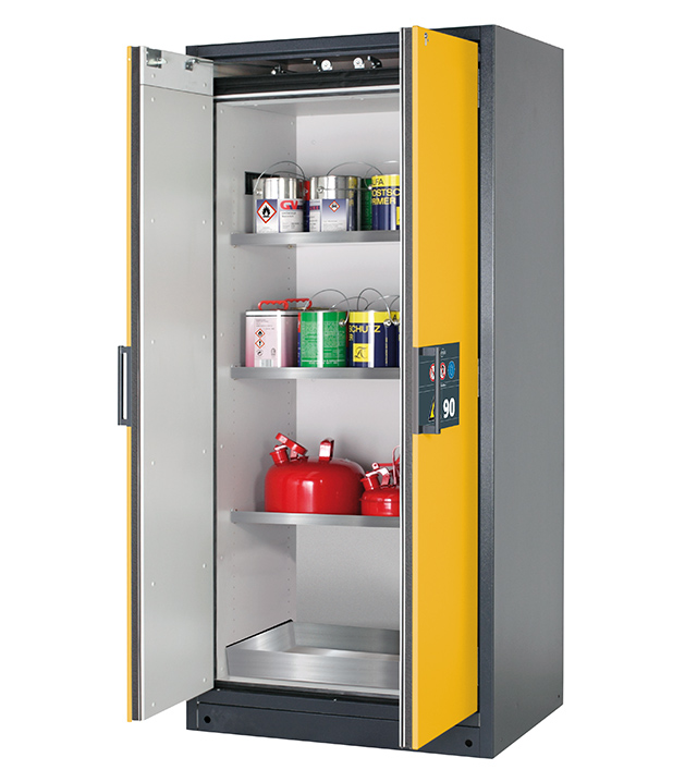 Korpusfarbe Anthrazitgrau (RAL 7016), mit Flügeltüren in Sicherheitsgelb (RAL 1004), Inneneinrichtung mit 3 x Fachboden, 1 x Bodenauffangwanne (Edelstahl 1.4301)