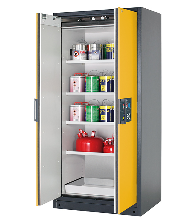 Korpusfarbe Anthrazitgrau (RAL 7016), mit Flügeltüren in Sicherheitsgelb (RAL 1004), Inneneinrichtung mit 4 x Fachboden, 1 x Bodenauffangwanne (Stahlblech pulverbeschichtet)