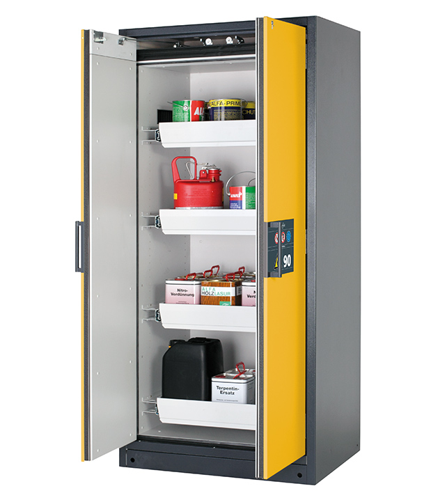 Korpusfarbe Anthrazitgrau (RAL 7016), mit Flügeltüren in Sicherheitsgelb (RAL 1004), Inneneinrichtung mit 4 x Auszugswanne (Stahlblech pulverbeschichtet)