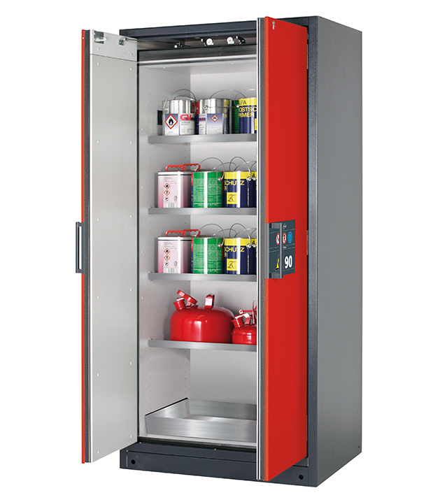 Korpusfarbe Anthrazitgrau (RAL 7016), mit Flügeltüren in Verkehrsrot (RAL 3020), Inneneinrichtung mit 4 x Fachboden, 1 x Bodenauffangwanne (Edelstahl 1.4301)