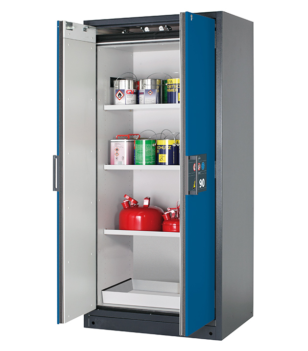 Korpusfarbe Anthrazitgrau (RAL 7016), mit Flügeltüren in Enzianblau (RAL 5010), Inneneinrichtung mit 3 x Fachboden, 1 x Bodenauffangwanne (Stahlblech pulverbeschichtet)