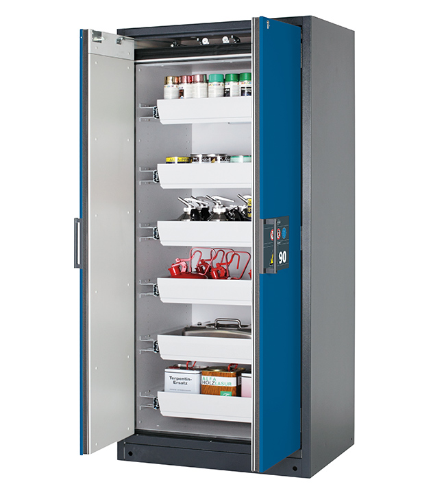 Bitte beachten Sie die jeweils gültigen, nationalen Regeln und Vorschriften zur Lagerung von Gefahrstoffen bei der Konfiguration Ihres Produktes. Sollten Sie unsicher sein, helfen Ihnen die asecos Experten gerne weiter.