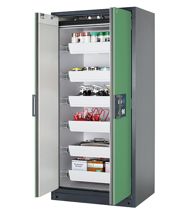 Bitte beachten Sie die jeweils gültigen, nationalen Regeln und Vorschriften zur Lagerung von Gefahrstoffen bei der Konfiguration Ihres Produktes. Sollten Sie unsicher sein, helfen Ihnen die asecos Experten gerne weiter.