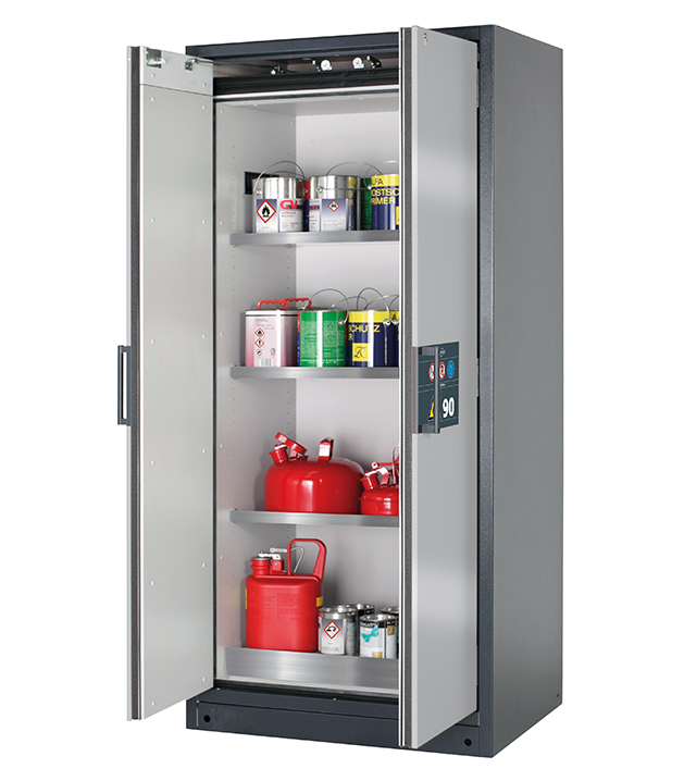 Korpusfarbe Anthrazitgrau (RAL 7016), mit Flügeltüren in asecos Silber, Inneneinrichtung mit 3 x Fachboden (Edelstahl 1.4301), 1 x Lochblecheinsatz (Edelstahl 1.4016), 1 x Bodenauffangwanne (Edelstahl 1.4301)