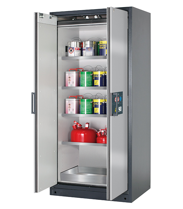 Korpusfarbe Anthrazitgrau (RAL 7016), mit Flügeltüren in asecos Silber, Inneneinrichtung mit 4 x Fachboden, 1 x Bodenauffangwanne (Edelstahl 1.4301)
