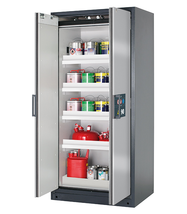 Korpusfarbe Anthrazitgrau (RAL 7016), mit Flügeltüren in asecos Silber, Inneneinrichtung mit 4 x Wannenboden, 1 x Bodenauffangwanne (PP)
