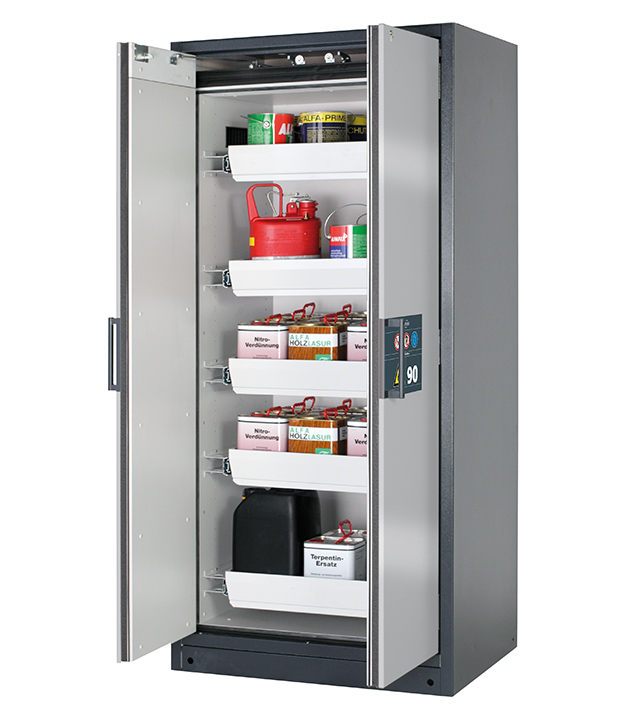 Korpusfarbe Anthrazitgrau (RAL 7016), mit Flügeltüren in asecos Silber, Inneneinrichtung mit 5 x Auszugswanne (Stahlblech pulverbeschichtet)