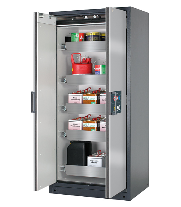 Korpusfarbe Anthrazitgrau (RAL 7016), mit Flügeltüren in asecos Silber, Inneneinrichtung mit 5 x Auszugswanne (Edelstahl 1.4301)