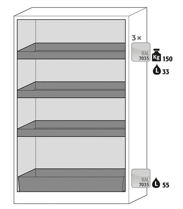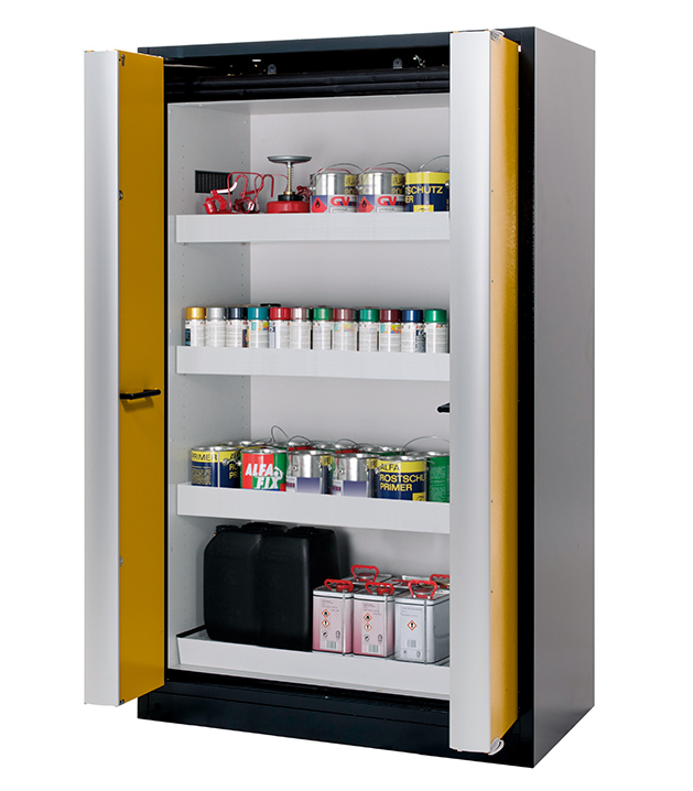 Korpusfarbe Anthrazitgrau (RAL 7016), mit Falttüren in Sicherheitsgelb (RAL 1004), Inneneinrichtung mit 3 x Wannenboden, 1 x Bodenauffangwanne (Stahlblech pulverbeschichtet)