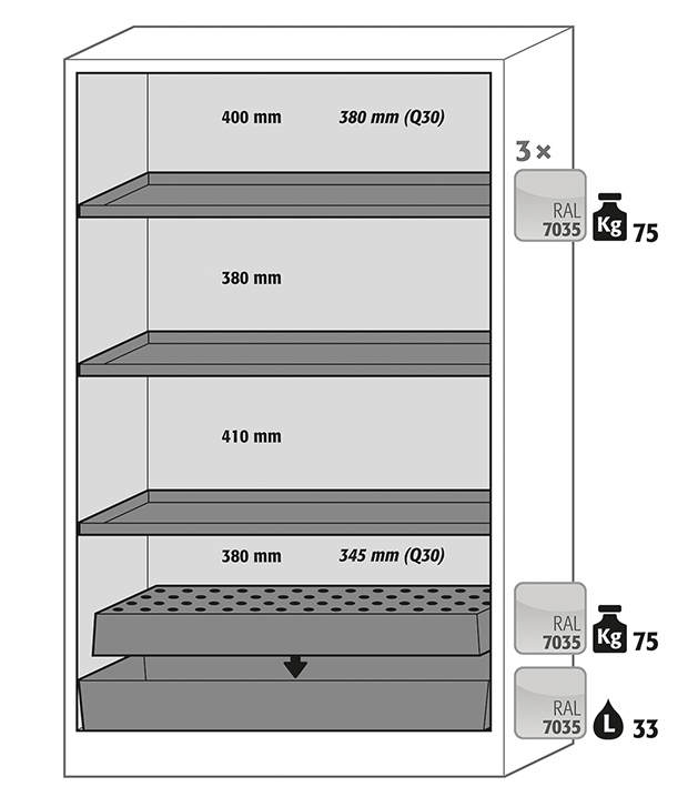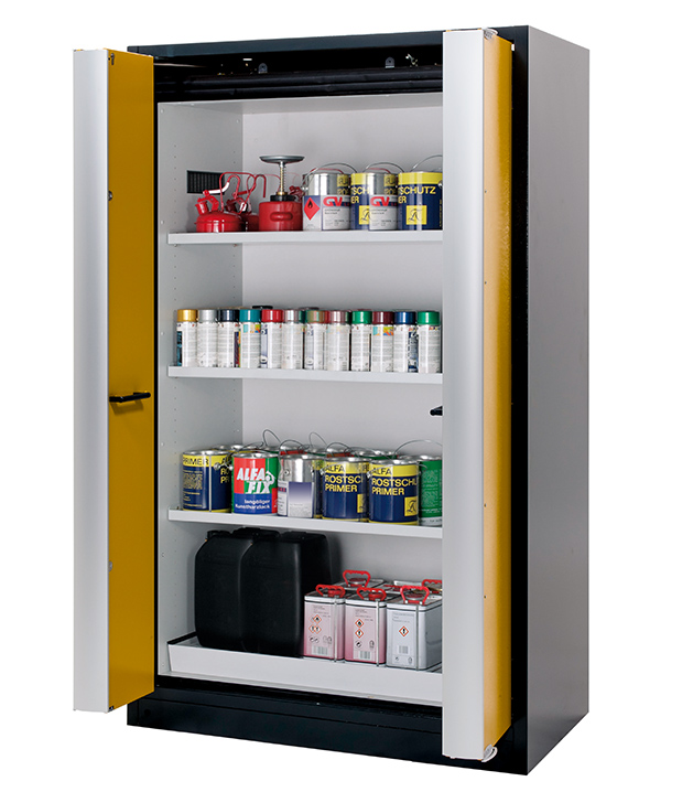 Korpusfarbe Anthrazitgrau (RAL 7016), mit Falttüren in Sicherheitsgelb (RAL 1004), Inneneinrichtung mit 3 x Fachboden, 1 x Lochblecheinsatz, 1 x Bodenauffangwanne (Stahlblech pulverbeschichtet)