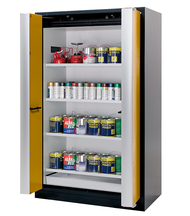 Korpusfarbe Anthrazitgrau (RAL 7016), mit Falttüren in Sicherheitsgelb (RAL 1004), Inneneinrichtung mit 4 x Fachboden, 1 x Bodenauffangwanne (Stahlblech pulverbeschichtet)