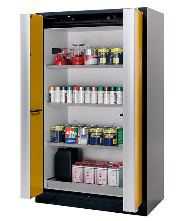 Bitte beachten Sie die jeweils gültigen, nationalen Regeln und Vorschriften zur Lagerung von Gefahrstoffen bei der Konfiguration Ihres Produktes. Sollten Sie unsicher sein, helfen Ihnen die asecos Experten gerne weiter.