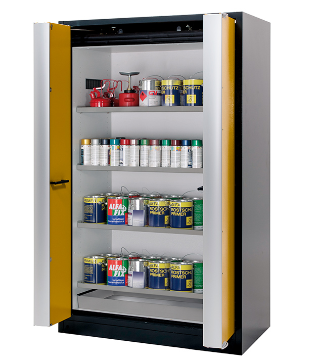 Korpusfarbe Anthrazitgrau (RAL 7016), mit Falttüren in Sicherheitsgelb (RAL 1004), Inneneinrichtung mit 4 x Fachboden (Edelstahl 1.4301), 1 x Bodenauffangwanne (Edelstahl 1.4016)