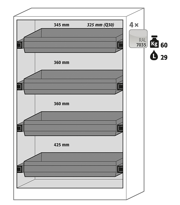 Korpusfarbe Anthrazitgrau (RAL 7016), mit Falttüren in Sicherheitsgelb (RAL 1004), Inneneinrichtung mit 4 x Auszugswanne (Stahlblech pulverbeschichtet)