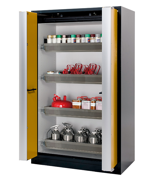 Bitte beachten Sie die jeweils gültigen, nationalen Regeln und Vorschriften zur Lagerung von Gefahrstoffen bei der Konfiguration Ihres Produktes. Sollten Sie unsicher sein, helfen Ihnen die asecos Experten gerne weiter.
