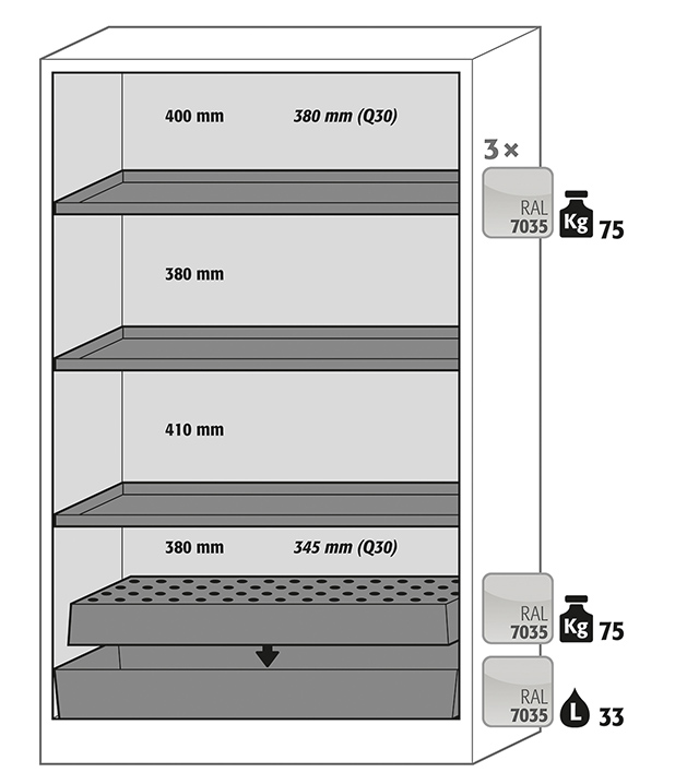 Korpusfarbe Anthrazitgrau (RAL 7016), mit Flügeltüren in Sicherheitsgelb (RAL 1004), Inneneinrichtung mit 3 x Fachboden, 1 x Lochblecheinsatz, 1 x Bodenauffangwanne (Stahlblech pulverbeschichtet)