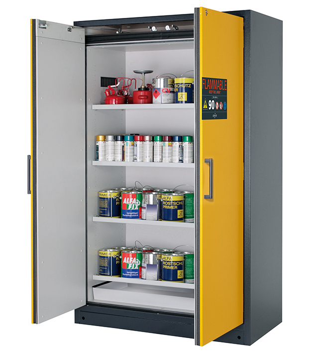 Korpusfarbe Anthrazitgrau (RAL 7016), mit Flügeltüren in Sicherheitsgelb (RAL 1004), Inneneinrichtung mit 4 x Fachboden, 1 x Bodenauffangwanne (Stahlblech pulverbeschichtet)