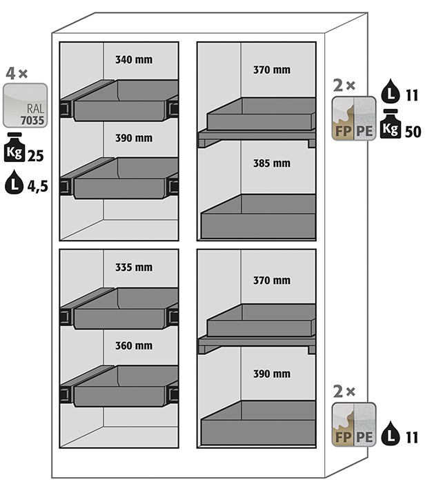 - Alles in einem: verschiedene Abteile (mehrfache Teilung) erlauben die Lagerung unterschiedlicher Gefahrstoffe in einem Schrank