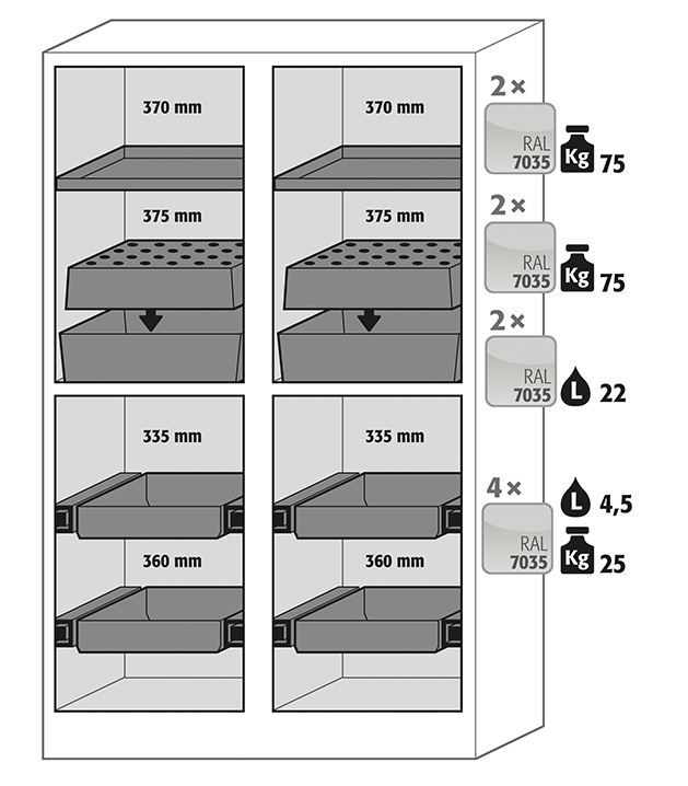 - Alles in einem: verschiedene Abteile (mehrfache Teilung) erlauben die Lagerung unterschiedlicher Gefahrstoffe in einem Schrank