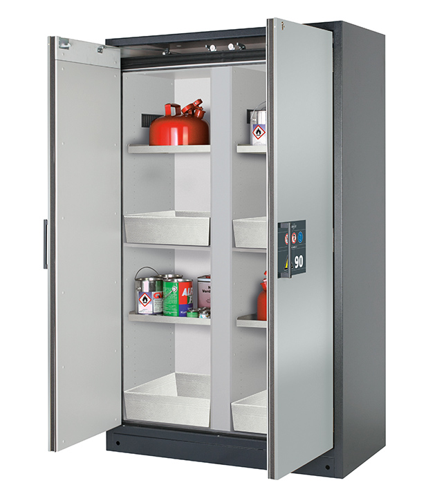 Korpusfarbe Anthrazitgrau (RAL 7016), mit Flügeltüren in asecos Silber