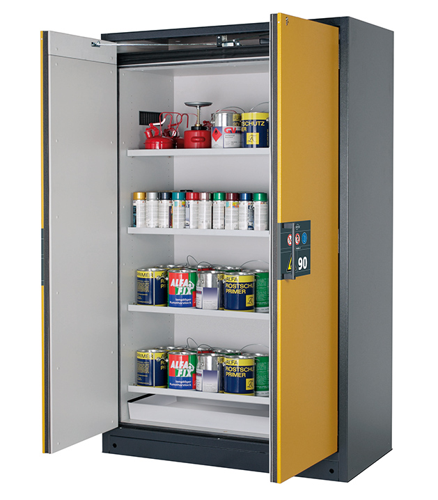 Korpusfarbe Anthrazitgrau (RAL 7016), mit Flügeltüren in Sicherheitsgelb (RAL 1004), Inneneinrichtung mit 4 x Fachboden, 1 x Bodenauffangwanne (Stahlblech pulverbeschichtet)