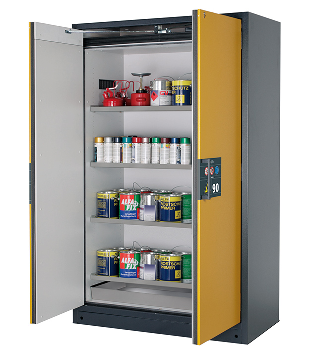 Korpusfarbe Anthrazitgrau (RAL 7016), mit Flügeltüren in Sicherheitsgelb (RAL 1004), Inneneinrichtung mit 4 x Fachboden (Edelstahl 1.4301), 1 x Bodenauffangwanne (Edelstahl 1.4016)