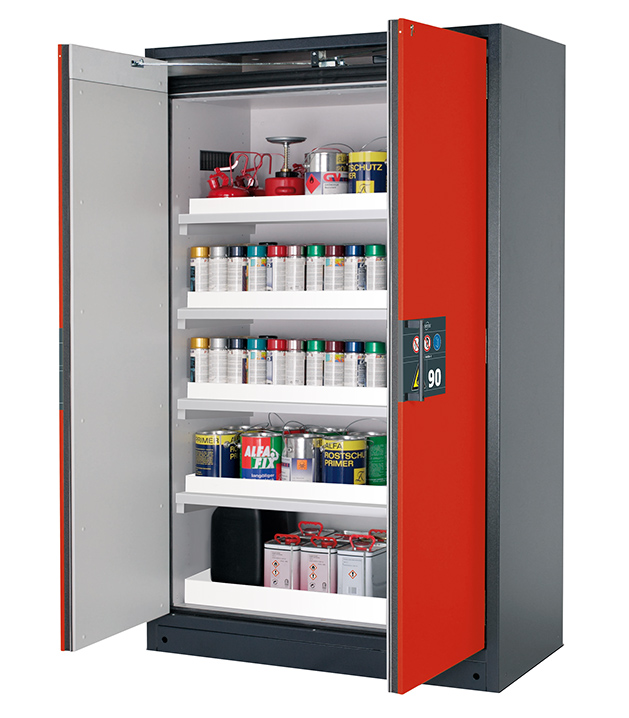 Korpusfarbe Anthrazitgrau (RAL 7016), mit Flügeltüren in Verkehrsrot (RAL 3020), Inneneinrichtung mit 4 x Wannenboden, 1 x Bodenauffangwanne (PP)